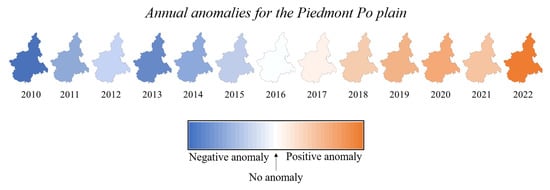 Finally, in order to provide an overview of the GWT increase on a regional scale, a representation of the annual GWT anomalies was proposed for the entire Piedmont Po Valley. The anomaly data of the 15 regionally distributed points was averaged into a single value. The GWT anomaly for each year analysed was calculated as the average of each monthly anomaly for each year. This provides a unique value for each year, which allows for the creation of an easy-to-use graphic representation for dissemination purposes.