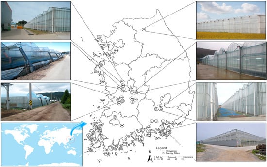 Among the improvements, the horticulture industry has been able to grow a variety of vegetables and fruits even in winter by keeping them warm using horticulture greenhouses [,,]. The horticulture industry in Korea has been recognized as a “white revolution” because it generates a lot of income [,]. It accounts for more than 40% of the horticulture industry, ranking third in the world in terms of area and significantly contributing greenhouse horticulture to the total agricultural income [,,,]. Various countries, such as China, Spain, the Netherlands, and Japan, are known as the world’s leading producers [,,]. Due to the number of its advantages, including year-round production, automation, short production runs, labor savings, and fast income generation, the area of horticulture continues to increase [,,]. However, a number of environmental and ecological problems have been reported, including rapid land use changes, groundwater depletion, waste disposal, and nonpoint pollution emissions due to the establishment of large-scale horticulture complexes [,,,,,]. Recent studies related to horticulture studies have focused on crop production, including environmental control, such as cooling and heating [,,], energy efficiency [,,], stability [,,], and nutrient solution [,,]; however, it is difficult to find studies on the creation of eco-friendly and ecological horticulture greenhouse complexes.