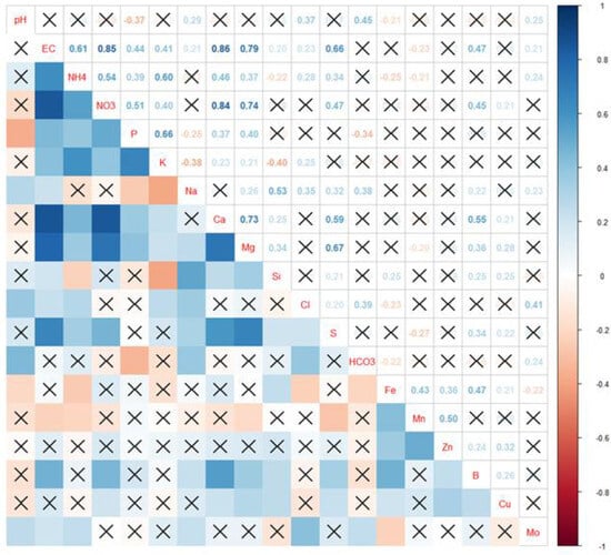 Based on the EC concentrations, most fertilizer components were correlated. NH4+-N (0.613**), NO3-N (0.846**), PO4-P (0.441**), K+ (0.414**), Na+ (0.214*), Ca2+ (0.858**), Mg2+ (0.792**), Si4+ (0.198*), Cl− (0.226*), and S2− (0.658**) were correlated with the EC. In addition, many correlations were found to be in the heavy metal category, such as Mn (−0.228*), Mo (0.206*), and B (0.470**).