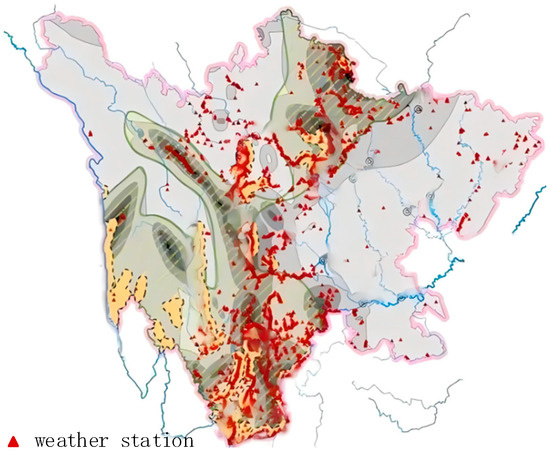 The research data on the rainfall patterns in the study area are all from the China Meteorological Station, with a total of 27 meteorological stations in the study area. The daily rainfall data for the whole year have passed a strict quality inspection, and six stations with missed measurements and observation years of less than 51 years have been excluded. Finally, 21 representative stations were selected to obtain the rainfall data of the undertaking area from these stations. Debris flow is a secondary disaster caused by rainfall, so rainfall data collection affects the final model construction effect. The terrain of the study area is shown in Figure 1.