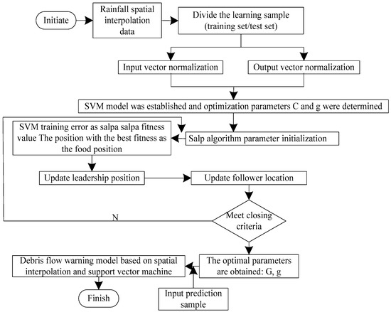 The mudflow warning based on SVM is an optimization problem to determine the optimal penalty parameter and RBF parameter . In this paper, the optimal penalty parameters are determined by the sea squirt algorithm and RBF parameters . The early warning model of debris flow based on the support vector machine (SVM) optimized by the sea squirt algorithm is constructed.