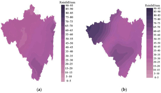 From Figure 3, we can clearly see the spatial distribution of rainfall in the study area, and we can obtain the rainfall distribution accurately and the rainfall situation. And from Figure 3b, we can intuitively see that the rainfall in July is obviously higher than that in June, August, and September, and the spatial interpolation result is consistent with the actual data in the study area, which shows that the spatial interpolation result is effective and accurate.