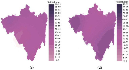Spatial interpolation results of precipitation in the study area. (a) June spatial interpolation; (b) July spatial interpolation; (c) August spatial interpolation; (d) September spatial interpolation.