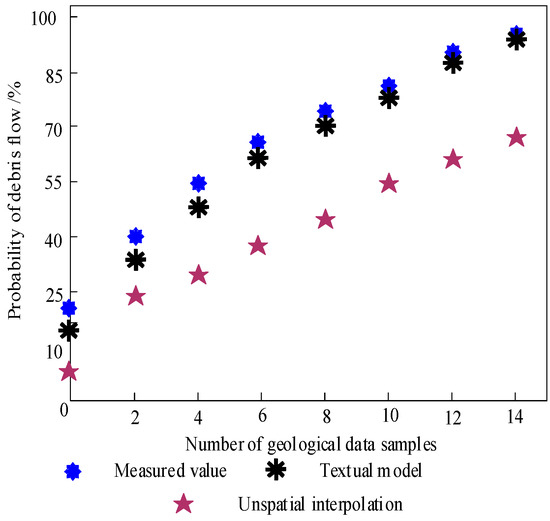 As a whole, Figure 4 shows that the more samples of rainfall data and geological data obtained from the study area, the closer the value of this early warning model is to the actual data of debris flow, but the early warning trend of the model without spatial interpolation is not obvious, which is also related to the number of samples, which once again shows that this model is more suitable for debris flow data processing with small sample characteristics. At the same time, the early warning result of this model is close to the actual value, which shows that it is possible to apply this model to the probability prediction of debris flow, and this model can accurately obtain the change in the debris flow in the study area and obtain more effective early warning results.