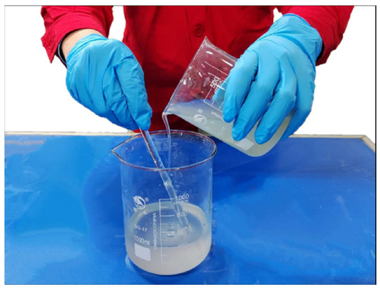 It is key to prevent and control debris flow in underground mines to achieve infiltration grouting of the moraine to consolidate fine-particle moraine. The moraine has a high density and extremely narrow pore channels. The results of calculation and preliminary exploration have shown that if cement-based grouting materials are used to achieve infiltration grouting of moraine, more than 95% of the particles of grouting materials must be smaller than 1.972 μm (7606 mesh), but the existing technology cannot achieve this condition. It is difficult to achieve grouting penetration with conventional cement slurry, so the inorganic chemical grouting materials developed for moraine are used. The grout mainly consists of water glass, hardener, and additives. Hardener is used to control the solidification time of the slurry, while the additives are mainly used to adjust the viscosity of the slurry to improve the injectivity of the slurry and to modify the moraine to improve the injectivity of the moraine itself. Each component of the slurry used in the experiment was pre-configured and diluted according to the principle of “powder” in “water” and “alkali” in “acid”. The prefabricated water glass and hardener (including additives) were mixed 1:1 in the experiment, and the slurry configuration process is shown in Figure 1.