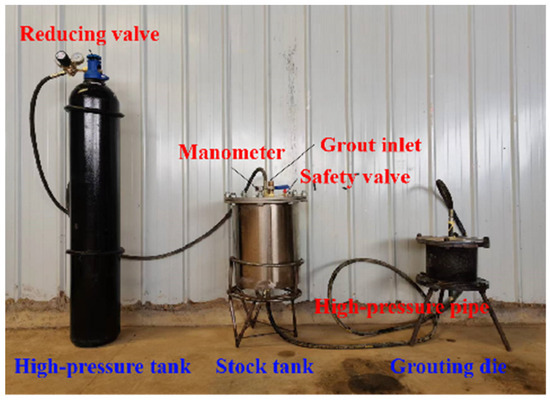 The experimental apparatus comprised three components: a power unit (compressed air reservoir), slurry storage container, and grouting mold. They were interconnected by high-pressure hoses with a pressure of 30 MPa. Figure 2 illustrates the connection arrangement of the apparatus. Once the entire grouting system was assembled, the uniformly prepared slurry was poured into the slurry storage bucket. Compressed air was then injected into the same bucket to initiate the pressure grouting process, with any excess slurry being discharged through the pressure relief hole situated at the top of the mold.
