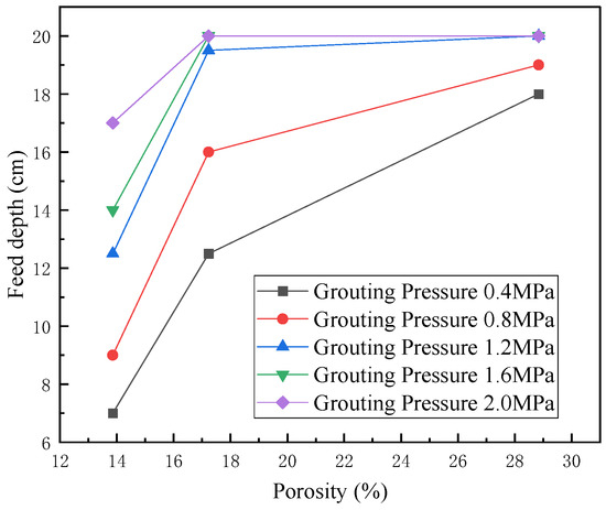 Figure 5 displays the grouting status of moraine samples of varying porosities. It is apparent from the illustration that the depth of the grouting increased proportionally with the porosity of the samples for identical grouting pressures. Porosity significantly affected each sample’s injection capability; however, as the porosity increased, its impact on injection depth dwindled. The moraine sample had a loose packing density of 1.47 g/cm3 and a loose porosity of 44.74%. Consequently, infiltration grouting was able to be achieved through the dead weight of the slurry without any additional pressure. Alternatively, the need for higher grouting pressure increased when the porosity was lower at the same grouting depth.