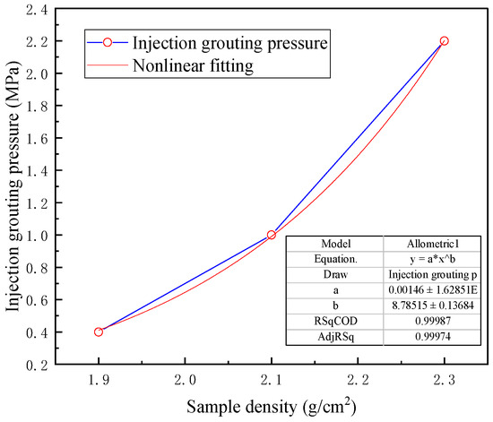 Figure 7 shows the relationship between the density of the moraine samples and the pressure of the osmotic grouting. Nonlinear fitting was used to obtain the relationship between the density of moraine samples and the pressure required to achieve osmotic grouting.