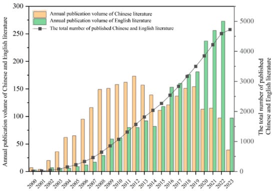 Comparison of the number of Chinese and English publications on constructed wetlands by Chinese scholars from 2000 to 2023.