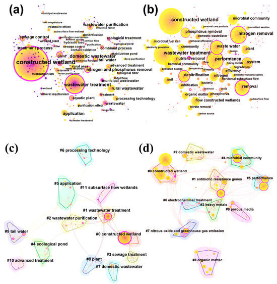 After clustering high-frequency keywords in the domestic literature on constructed wetlands, according to Figure 2c,d, the research topics of domestic scholars on constructed wetland wastewater treatment technology since 2000 can be mainly summarized into the following categories, and these research topics show some differences in the Chinese literature and English literature: