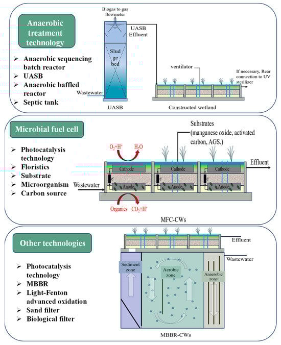 Finally, constructed wetlands are also being combined with technologies like photocatalysis [], sand filters [], the photo-Fenton advanced oxidation process [], moving Bed Biofilm Reactors (MBBR) [], and electrolysis technology []. These combinations have effective treatment effects on cadmium-containing wastewater, organic matter, drugs, and other refractory organic matter.