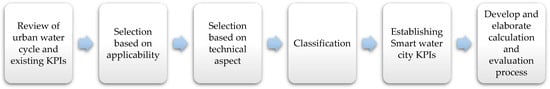 For this study, the indicators designated to evaluate the characteristics of urban water and the strategies implemented by the city to optimize the water management, showcasing features recognizable as a smart water city, shall be referred to as technical key performance indicators (KPIs). The development of these KPIs follows the methodology outlined in the figure below (Figure 1).