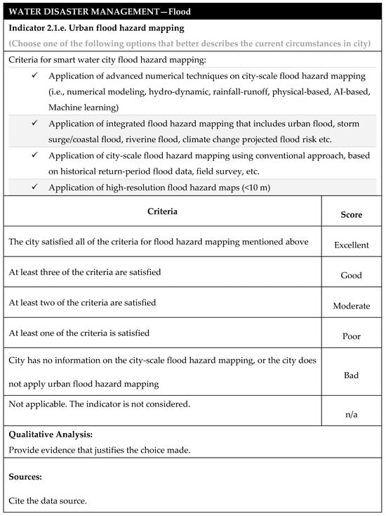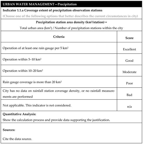 Calculation methods are systematically compiled for each indicator based on an extensive literature review. For quantitative indicators, the computational formulas and standards are derived from the existing guidelines found in research articles, reports and frameworks established by credible organizations. For example, the recommended rainfall observation coverage density for urban areas according to the WMO (2020) [] is at least one rain gauge for every 10–20 km2 surface area. An example of the evaluation form for smart water city assessment can be seen in Figure 2. These types of indicators determine the percentage or ratio of a certain value and its correlation to the recommended value from the established literature. This involves the use of numerical data or statistical analysis, focusing on the quantifiable measures to analyze the performance of the city.
