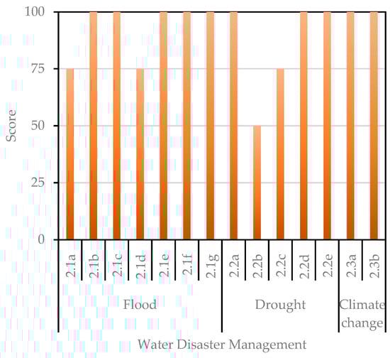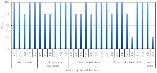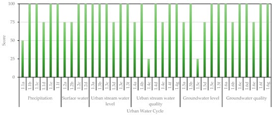 The smart water city evaluation for Busan Eco Delta City, as part of Busan Metropolitan City, is presented for each category in Figure 5, Figure 6 and Figure 7. The horizontal axis delineates the individual key technical key performance indicators, while the vertical axis illustrates the final scoring for each KPI. The graphical representations offer an overview of the city’s performance across various water management categories, showing its strengths and areas for improvements.