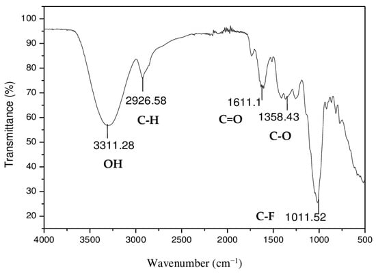 FTIR measurements were conducted to understand the possible functional groups existing for interactions between metallic ions and the orange peel adsorbent. Figure 1 shows that the spectrum is characterized by the presence of a characteristic peak at 3311.28 cm−1 attributed to the elongation of the N–H [48,49] or most likely representing O–H group stretching vibrations (of carboxyl, phenols, or alcohols) [50,51]. This is quite logical if one considers that the main constituents of orange peels are cellulose, lignin, and hemicelluloses, all constituents that are rich in different kinds of –OH groups, as well as vicinal phenolic –OHs and –OCH3 groups belonging to flavonoids, such as hesperidin glucoside, known to be abundant in orange peels. The band at 2926.58 cm−1 generally characterizes aliphatic C-H stretching vibrations [52,53,54]. The band appearing in the orange peel powder spectrum at 1611 cm−1 is attributed to the C=O groups of carboxylic acids, mainly both the acetate groups (COO−) of hemicelluloses and of the esters of citric acid, present in all citrus peels, as well as the carbonyl groups of ketones, like the one on the C4 site of hesperidin, as well as traces of aldehydes or lactones [55]. The presence of a peak at 1358 cm−1 attributed to C–O stretching supports the existence of numerous and varied carboxyl/alcohol/ether/ester functional groups in the absorbent. The probability of the presence of aliphatic fluorinated compounds (C-F), which are characterized by a peak at 1011.5 cm−1 in the FTIR spectrum of the orange peel [56,57], exists but is unlikely, as more likely, it is a confirmation of the existence of aromatic nuclei in the mixture of the material constituents.