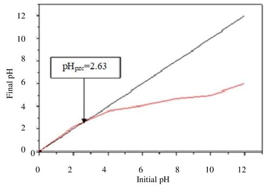 The pH at the point of zero charge (pHpzc) of materials is a good indicator of the chemical and electronic properties of functional groups on their surface. The pHpzc of the biosorbent was calculated as follows: Solutions of 50 mL of NaCl (0.01 M) were placed in flasks. The pH in each flask was adjusted by adding drops of solutions of NaOH or HCl (0.1 M) to achieve initial pH (pHi) values ranging between 2 and 12. In each flask, 0.15 g of the biosorbent (Orange peel) was added. The flasks were kept closed at room temperature for 48 h, and then the final pH (pHf) was determined. On the graph of pHf = f(pHi), the intersection of the curve with the quadrant bisector represents the iso-electric point (pHpzc) [41,42].