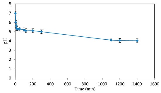 The contact-free pH was determined by introducing 1 g of the biosorbent in 100 mL of distilled water, and the sample was stirred at 300 rpm for 24 h. The sample was centrifuged and, finally, the pH of the filtrate was measured using a pH meter (Jenway model 3540, Camlab, Cambridge, UK).