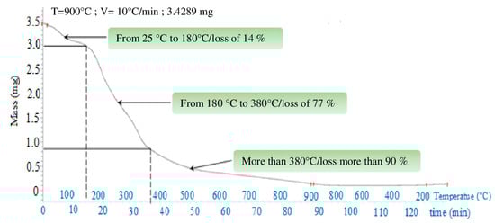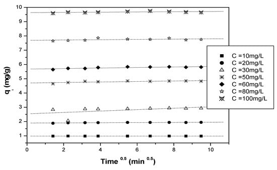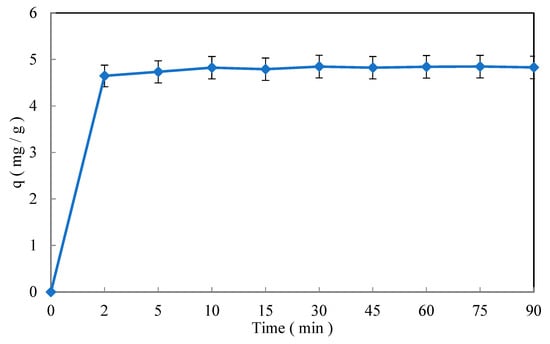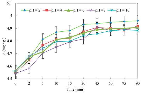 whereas the quantity of the adsorbed pollutant (q) expressed in mg of pollutant per g of adsorbent (mg/g) was calculated according to the following Equation (3):