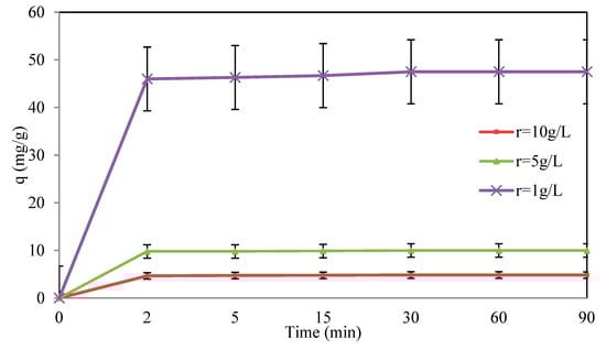 The examination of the influence of the solid–liquid ratio (r) on the adsorption capacity of Cr(VI) on the orange peels was conducted by varying the biosorbent dosage among 0.1, 0.5, and 1 g in 100 mL working solution.
