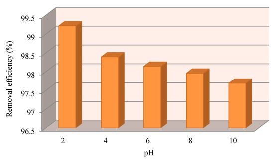 To optimize the pH, a study of the Cr(VI) adsorption as a function of the pH varying withing the range from 2 to 10 was carried out with an initial Cr(VI) concentration of 50 mg/L and a dosage of the adsorbent of 10 g/L.