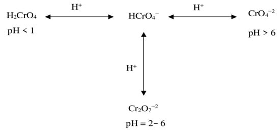 - Brito, F.; Ascanio, J.; Mateo, S.; Hernfindez, C.; Araujo, L.; Gili, P.; Martín-Zarza, P.; Domínguez, S.; Mederos, A. Equilibrium of Cr(VI) Species in Acid Medium and Adsorption Studies of These Species. Polyhedron 1997, 16, 3835–3846. [Google Scholar] [CrossRef]