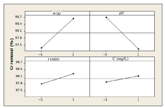 To understand in depth the effect of the operating parameters and their interactions on the Cr(VI) removal efficiency, a full factorial design study was conducted and is described in the following subsections.