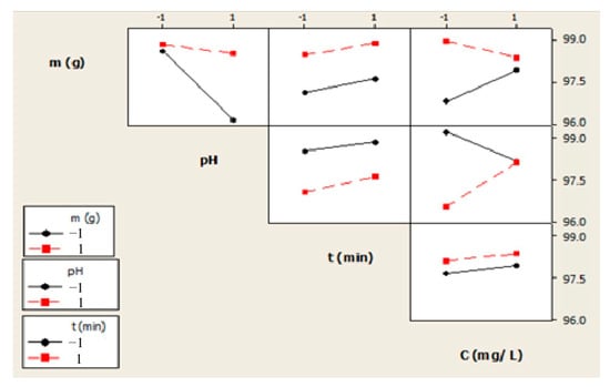 In order to obtain the optimal conditions for adsorption, a full nk factorial design was performed, where n = the number of levels and k = the number of factors being evaluated. For the present study, n = 2 and k = 4, as detailed in Table 1. Thus, the total number of required experiments was 24. If Y is the response variable, the four parameters’ regression equation and their interactions are evaluated through the following Equation (4):