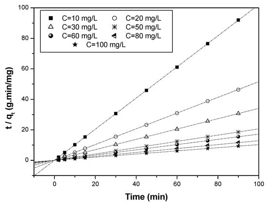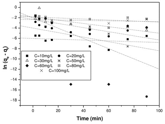 The mathematical expressions of the pseudo-first- [44] and pseudo-second-order [45] models as well as the intra-particle kinetic model are reported in the following Equations (5)–(7):