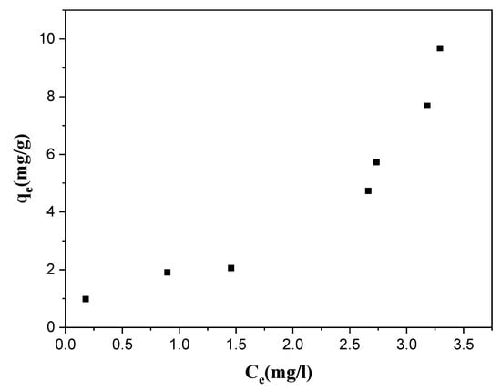 Different adsorption isotherm models are available in the literature to process the adsorption process experimental data [46,47]. Among them, in this work, the Langmuir, Freundlich, and Elovich isotherms were used. In what follows, we report the linear relationships of the 3 models: Equations (8), (9), and (10), respectively.