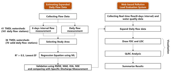 Through the daily flow expansion methodology developed in this study, when evaluating TMDL this study aims to secure high-resolution time series data and to reduce flow prediction uncertainty in high- and low-flow conditions. Also, by integrating GIS capabilities, this research seeks to develop a comprehensive and user-friendly system that facilitates pollution load assessments and management (Web GIS-based automated pollution load assessment system). The overarching goal is to provide stakeholders, including environmental regulators, researchers, and the general public, with accessible and efficient tools for understanding and addressing water quality issues.