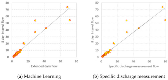 2.2.3. Comparison of the Expanded Daily Flow Using Machine Learning and Specific Discharge Measurement Method