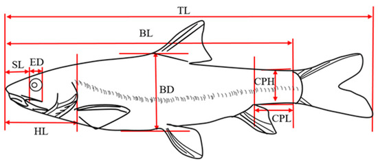 Traditional morphological measurements and the frame method were used to measure the total length (TL), body length (BL), body height (BD), body width (BW), head length (HL), snout length (SL), and eye diameter (ED). Eye interval (EI), caudal peduncle length (CPL), and caudal peduncle height (CPH) were also measured [19,20] (Figure 2).