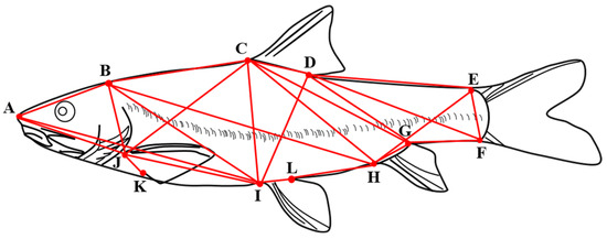 The frame measurements were determined by 12 anatomical coordinate points [21] (Figure 3), and the 24 frame distances were as follows: tip of snout to the last end of the frontal maxilla (A—B), tip of snout to origin of dorsal fin (A—C), tip of snout to insertion of pelvic fin (A—I), tip of snout to insertion of pectoral fin (A—J), the last end of the frontal maxilla to origin of dorsal fin (B—C), the last end of the frontal maxilla to insertion of pelvic fin (B—I), the last end of the frontal maxilla to insertion of pectoral fin (B—J), origin of dorsal fin to terminus of dorsal fin (C—D), origin of dorsal fin to ventral origin of caudal fin (C—F), origin of dorsal fin to origin of anal fin (C—H), origin of dorsal fin to insertion of pelvic fin (C—I), origin of dorsal fin to Insertion of pectoral fin (C—J), terminus of dorsal fin to dorsal origin of caudal fin (D—E), terminus of dorsal fin to ventral origin of caudal fin (D—F), terminus of dorsal fin to origin of anal fin (D—H), terminus of dorsal fin to insertion of pelvic fin (D—I), dorsal origin of caudal fin to ventral origin of caudal fin (E—F), dorsal origin of caudal fin to origin of anal fin (E—H), ventral origin of caudal fin to origin of anal fin (F—H), terminus of anal fin to origin of anal fin (G—H), origin of anal fin to insertion of pelvic fin(H—I), insertion of pelvic fin to insertion of pectoral fin (I—J), insertion of pelvic fin to terminus of pelvic (I—L) and insertion of pectoral fin to terminus of pectoral fin (J—K).