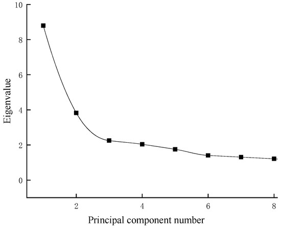 The KMO test (KMO = 0.767) and Bartlett’s test of sphericity (p < 0.01) were performed. The KMO test value was 0.767 (>0.600), and the correlation between the variables was strong, which indicated that the morphological differences between the geographically distinct groups of G. dybowskii were suitable for the principal component analysis. As shown in Figure 5, after the third principal component, the eigenvalues of the principle components tended to stabilize. Therefore, the first three principal components were selected for analysis (PC1~PC3).