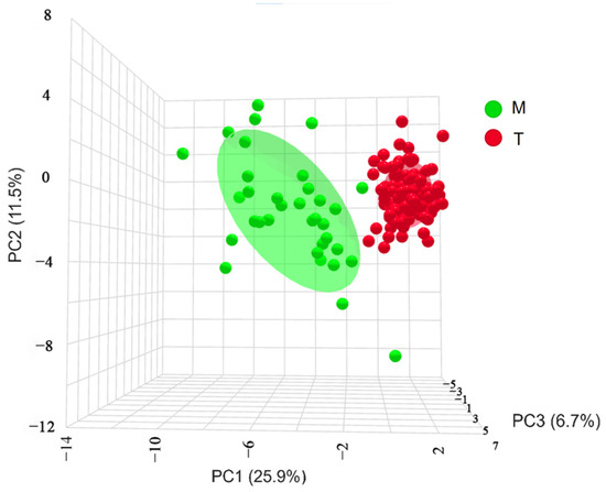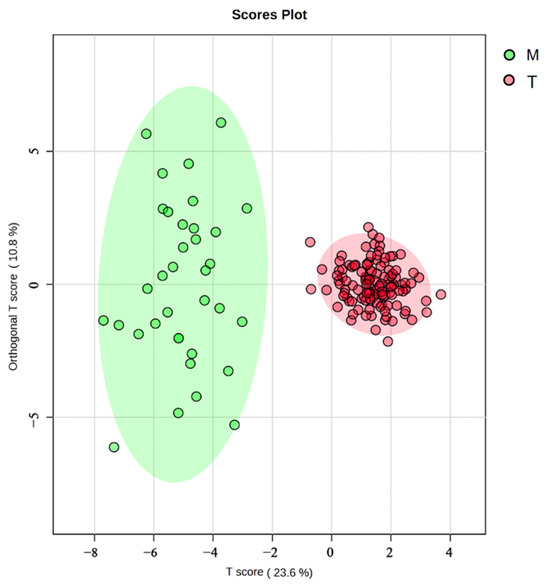 OPLS-DA of G. dybowskii from geographically distinct populations; T is the population from the Turks River, and M is the population from the Manas River; the vertical coordinate “Orthogonal T Score” indicates the orthogonal principal components test score, which responds to within-group differences. The horizontal coordinate “T Score” indicates the predictive principal component test score, which reflects the difference between groups.