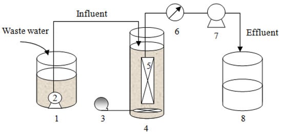Schematic diagram of the MBR reactor. (1) Influent tank; (2) submersible pump; (3) aerator; (4) MBR; (5) membrane module; (6) pressure gauge (7) peristaltic pump; (8) effluent tank.