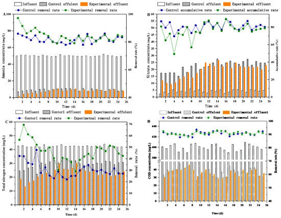 The influent ammonium concentration was 49–52 mg·L−1. From Figure 2A, it can be seen that, within the first week, the ammonium nitrogen removal rate of the experimental system through bioaugmentation was enhanced compared with the control system. Therefore, the process of bioaugmentation was divided into two stages and the first week was determined as stage 1. After the application of the bioaugmentation, the favorable ammonium removal rate was monitored in the experimental system during stage 1, with an average of 90.11%, resulting in the ammonium nitrogen concentration ranging from 1.14 to 7.14 mg·L−1. The enhancement of ammonium nitrogen removal could be connected to the addition of the inoculated compound strains (N7 and N9). Therefore, it was reasonable to conclude that these compound strains, along with the strategy of biofilm carriers, effectively improved the ammonium nitrogen transformation of the system. Similarly, previous studies illustrated that the application of bioaugmentation in various reactors obtained a better rate of ammonium nitrogen removal than the control systems [,,].