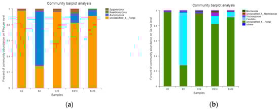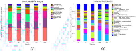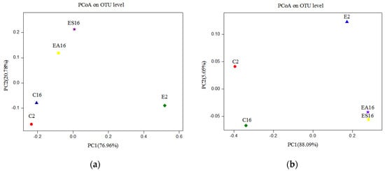 As shown in Figure 3a the PCoA of fungal communities illustrated that there was a significant difference in the fungal communities (samples E2 and E16) after inoculation with N7 and N9 in contrast to the control group’s communities (samples C2 and C16). In the experimental group, the communities of suspended fungi were similar to the attached fungal communities (samples ES16 and EA16). Among the five samples, the bacterial community was significantly different except for samples ES16 and EA16, as shown in Figure 3b. The composition of the bacterial communities in suspended and attached organisms was similar, which accounted for how they were located close together in the coordinates. These distinguished fungal and bacterial communities indicated that the strategy of inoculating strains had a great impact on the whole community structure in this bioreactor.