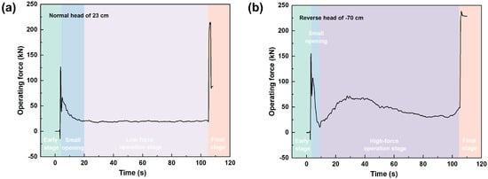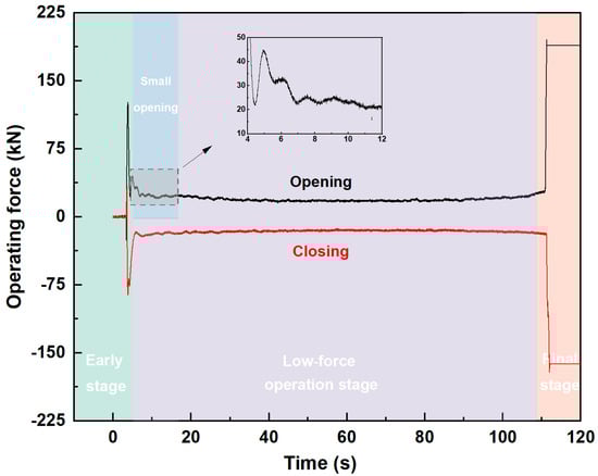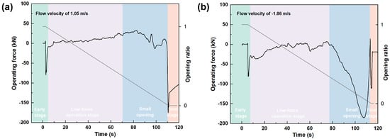 Figure 7a,b illustrate the distribution of operating forces during gate closing under flow conditions for both normal and reverse flows. The forces for both flow directions are divided into four stages: initial, low-force operation, small opening, and final stage.