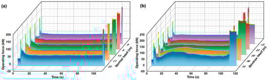 Before the formal prototype testing, conducting preliminary experiments to validate the accuracy of the hydraulic cylinder’s output force and ensure the correctness of the force variation trend is essential. This practice aids in detecting any anomalies in the data and allows for timely corrections and recalibrations, thereby ensuring the accuracy and reliability of the test results. Multiple opening and closing operations under different water level conditions, including zero head and large head differentials, were tested at this stage. The preliminary experiment results suggest a consistent variation trend in the operating force of the two gates on the inland waterway side, with similar force values observed. Moreover, the data exhibit good reproducibility, with force values changing in accordance with the gate operational status. This reveals the reliability and accuracy of the testing method.
