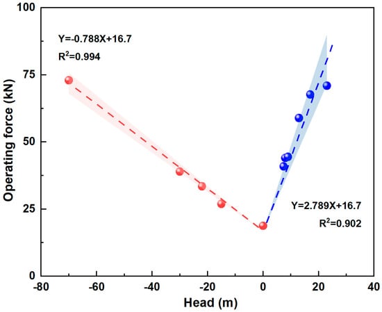 The relationship between head and operating force during gate opening under flowing conditions (red points represent peak forces during the high-force operation stage, while blue points represent peak forces during the small opening stage; the red and blue areas represent the 95% confidence band).