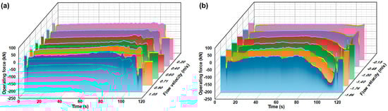The experiment also analyzed the operating forces of the sector gate during the closing process under different flow velocities in the chamber. The focus was on the temporal variation of these forces. The primary objective of this phase of the experiment was to compare and analyze the differences and variations in the force characteristics under flowing conditions. The velocities of the normal flow downstream (from the inland river to the Yangtze River) were set at gradients of 0.20 m/s, 0.40 m/s, 0.60 m/s, 0.71 m/s, 0.90 m/s, and 1.05 m/s, while upstream reverse flow velocities had gradients of −0.15 m/s, −0.48 m/s, −1.00 m/s, −1.40 m/s, −1.74 m/s, and −1.86 m/s, respectively. The closing force data are presented graphically in Figure 6.
