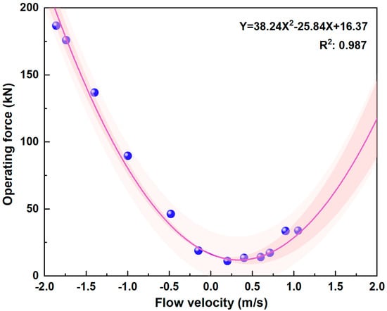 A notable difference in force application between the two flow directions is observed primarily during the low-force operation stage. In the case of reverse flow, a pronounced peak in the push force occurs in the small opening stage. As the gate approaches closure, the decreasing opening results in increased flow resistance, requiring more force to close. A similar increase in pushing force toward the end of the closure is also observed for normal flow, although the magnitude of the force is significantly lower compared to reverse flow. This difference occurs because, unlike the transverse forces exerted by the flow as it strikes the skin plate, the flow passing through the recesses in the gate structure tends to facilitate gate opening. Consequently, hydraulic cylinder systems require additional output force to counteract this tendency. The gate operation in both flow directions during the low-force operation stage is smooth, the flow direction having a limited influence on the forces during this stage. In addition, during the small opening stage, the peak pushing force shows a positive correlation with the absolute value of the flow velocity, which shows a good fit with a quadratic polynomial function, with a coefficient of determination reaching 0.987 (Figure 8). Statistical analysis indicates that when the flow impinges on the trusses, the maximum operating force during the entire closing process occurs at gate opening ratios of 5–10%. When designing sector gates that frequently operate under reverse flow conditions, special attention should be paid to the operating forces during this phase, as they affect the selection of hydraulic cylinder systems. In summary, flow velocity is a critical factor influencing the closing forces under flowing conditions. While different flow directions have only a moderate effect on the forces during the small opening stage, there is little variation in the other three stages.