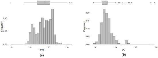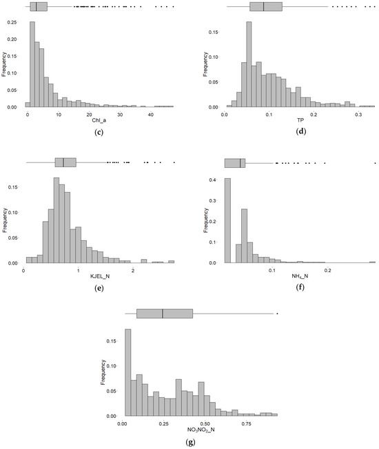 Frequency distribution plots of targeted water quality parameters in the Vaal Dam: (a) Temperature; (b) Dissolved oxygen; (c) Chlorophyll-a; (d) Total phosphorus; (e) Organic nitrogen; (f) Ammonia; and (g) Nitrate and Nitrite. The extreme values falling outside whiskers of the boxplots represented by black dots.