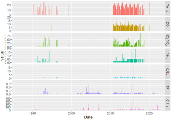 Historical water quality was obtained from the Department of Water and Sanitation (http://www.dwa.gov.za/iwqs/wms/data/WMA08_reg_WMS_nobor.htm), accessed on 2 January 2023. The data contains chemical and physicochemical water quality parameters from the Vaal Dam Reservoir. Daily water quality data include Chl−a, Total Phosphorus (TP), Dissolved Oxygen (DO), KJEL Nitrogen (KJEL_N), Ammonia Nitrogen (NH4_N), Nitrate and Nitrite Nitrogen (NO3NO2_N), and water Temperature (Temp) have been downloaded. Some gaps of data missing data existed in some chosen parameters, the records were poor with a big gap noticed between 2000 and 2010 for all-targeted water quality parameters except Chl−a and TP. A good record was only found for the period between 2010 to 2019. Thus, the distribution, time series, and decadal trend plots as well as regressions between the variables were generated using the available data only, no gap-fill approach was applied. The continuous DO records are only available from 2010 to 2019.
