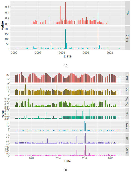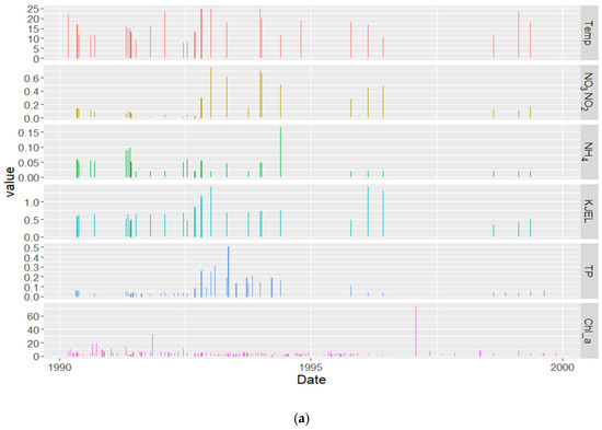 The time series of the temperature showed seasonal variations which have a strong influence on DO levels, the DO concentrations are decreasing during summer months when the temperature and Chl−a are relatively high (Figure 3 and Figure 4c). The Chl−a concentration time series recorded many peak values (Figure 3) on some erratic dates. The time series plots of the TP and KJEL_N also show some recorded high values corresponding to the same dates of Chl−a high values, reaching up to 1.15 mg/L and 18 mg/L for TP and KJEL_N, respectively, mainly during the period between 2015 and 2017 (Figure 4c) and between 2004 and 2008 for phosphorus where it jumped up to 0.75 mg/L (Figure 4b). DO, NO3NO2_N, and NH4_N did not show a clear correlation with the Chl−a time series. But in general, the time series of NO3NO2_N showed low values during the high levels of Chl−a concentrations, and it appears to show a periodic cycle (1.5-year) during the last decade (Figure 3 and Figure 4c).