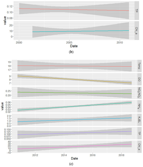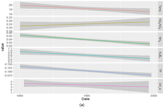 From the decadal trend analysis (Figure 5a–c), Chl−a shows a decreasing trend during the first decade from 1990 to 2000 with low trend average values ranging from ~5.5 to ~4 μg/L and it remains constant during the second decade from 2000 to 2010 with higher mean trend average value, then it showed an upward trend during the last decade from 2010 to 2020, which raised from ~7 to 30 μg/L. TP average trend levels showed the same pattern as Chl−a, it showed a downward trend from around 0.137 mg/L to around 0.075 mg/L during the first decade and showed a nearly constant trend during the second decade with a trend average value of ~0.11 mg/L before it started showing an upward trend during the last decade, where the trend average value increased from around 0.11 to 0.125 mg/L. KJEL_N and NH4_N followed the same pattern as Chl−a and TP, they showed a downward trend during the first decade from ~0.95 mg/L to ~0.65 mg/L and from around 0.053 mg/L to 0.025 mg/L, respectively, and they showed an upward trend during the last decade, KJEL_N from 0.75 to 1.75 mg/L and NH4_N from ~0.028 to 0.06 mg/L. DO showed a decreasing trend during the last decade which decreased from ~9 to ~7 mg/L. The NO3NO2_N concentration showed an upward average trend during the first decade from ~0.22 to ~0.26 mg/L while remaining nearly constant with an average trend value of around 0.225 mg/L in the last decade. The average trend of temperature shows a slight decrease from ~20 to ~17 °C from 1990 to 2000 and a nearly constant average trend value of ~18 °C from 2010 to 2020.