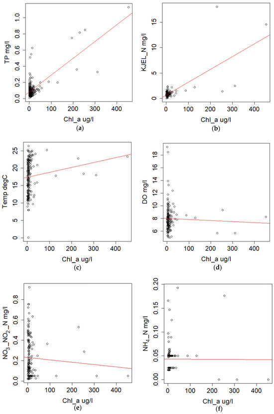 Scatter plots between Chl−a and various water quality parameters; (a) Chl−a vs. TP; (b) Chl−a vs. KJEL_N; (c) Chl−a vs. temperature; (d) Chl−a vs. DO; (e) Chl−a vs. NO3NO2; and (f) Chl−a vs. NH4. The trend lines (red) showing the relationship between the two variables composing the scatter plot.