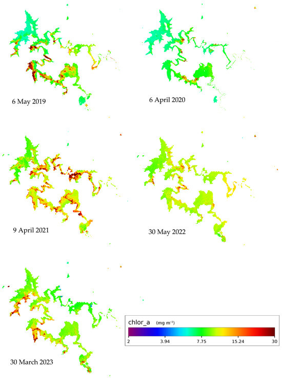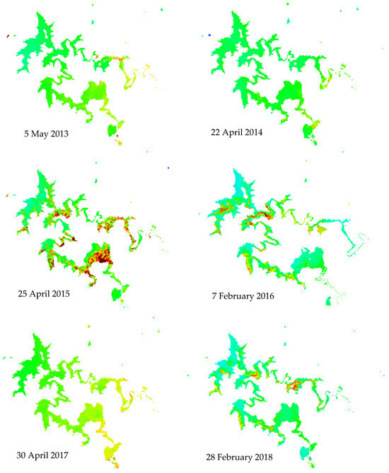 The satellite-based time series analysis showed the spatial and temporal variability and the HABs dynamics across the dam. The satellite data were normalized to compare the variation between those mentioned on different dates. In general, the images showed high levels of Chl−a concentration which is linked to the summer blooms and the load of nutrients to the system with the summer storm runoff, for example, the image dated 7 February 2016, was captured 10 days after a very high record of Chl−a concentration at the measuring point (452 μg/L). Generally high productivities were seen near the Vaal and Wilge rivers discharge areas in most of the images, also high productivity levels were seen where the reservoir is shallow and meandering (Figure 7).