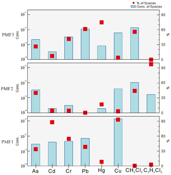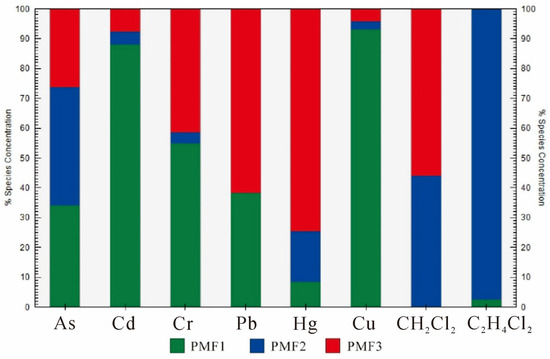 According to the factor profile of PMF, the average contribution of sample sources to the total mass was calculated (Figure 6). The results showed that As, Cd, Cr, Cu and Pb are mainly from agricultural sources, with a contribution rate of 39.84%. CH2Cl2 and C2H4Cl2 are mainly affected by anthropogenic industrial sources, with a contribution rate of 26.13%. Hg is from an industrial sedimentation source, with a contribution rate of 34.04%.